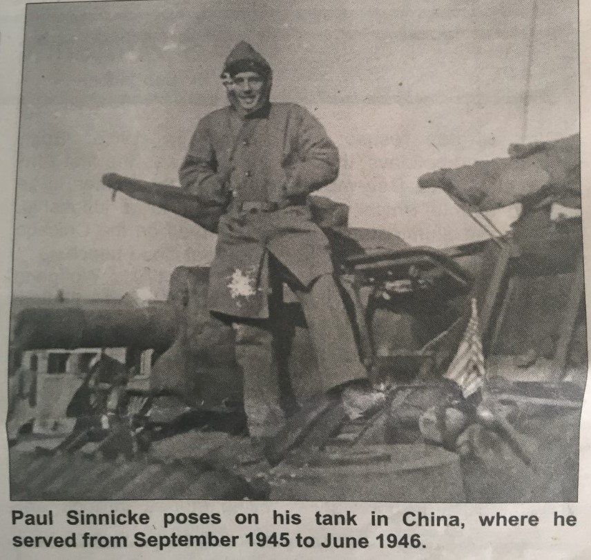 World War II ended shortly thereafter and Corporal Sinnicke was next stationed in China to assist in the reconstruction efforts following their enemy occupation. After ten months in China Paul returned stateside and was honorably discharged at Bainbridge, Maryland. He was the recipient of the Distinguished Service and Good Conduct medals. Both of Paul’s younger brothers also served in the military, Henry in the Army, and Richard in the Air Force.